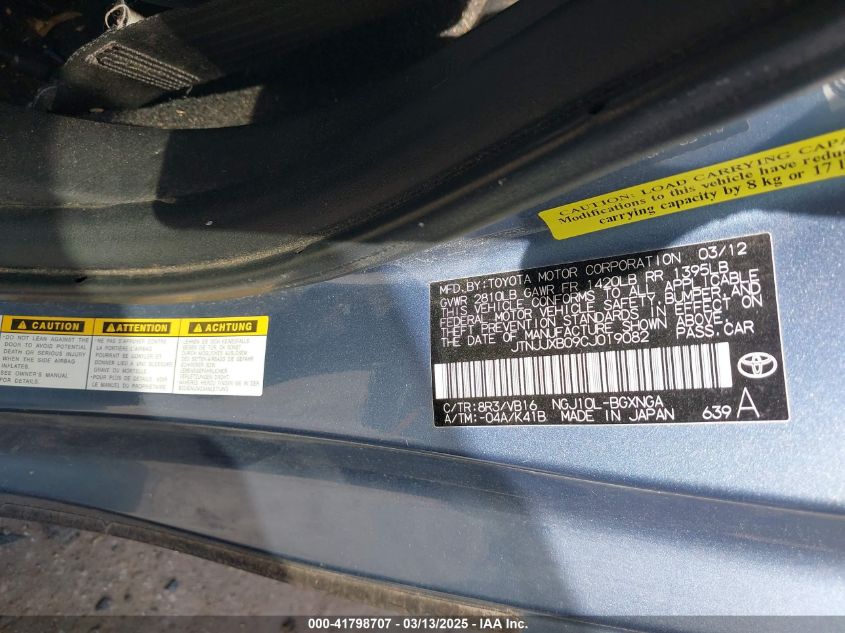 Color BlueCylinders 4Drive Front wheel driveVIN JTNJJXB09CJ******State Run & Drive VerifiedDamage Front or back