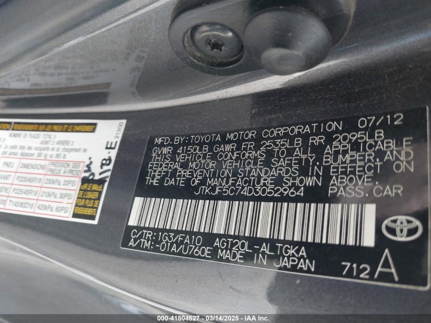 Color BlackCylinders 4Drive Front wheel driveVIN JTKJF5C74D3******State Run & Drive VerifiedDamage Front left AutoRIA