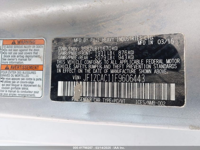 Color SilverCylinders 4Drive Rear wheel driveVIN JF1ZCAC11F9******State Run & Drive VerifiedDamage Front or backAuction date 2025-03-26 AutoRIA