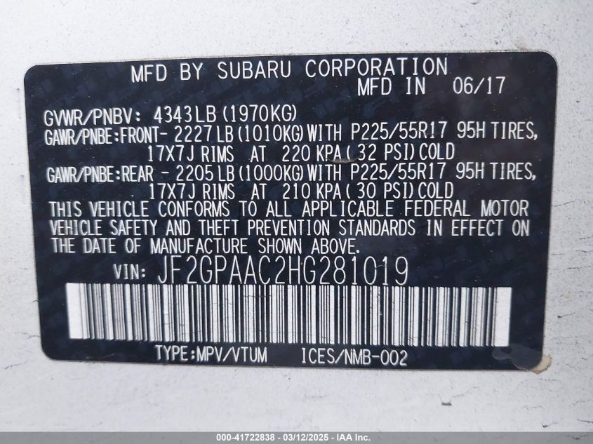 Color WhiteCylinders 4Drive Full driveVIN JF2GPAAC2HG******State Run & Drive VerifiedDamage Front or backAuction date 2025-03-21 AutoRIA