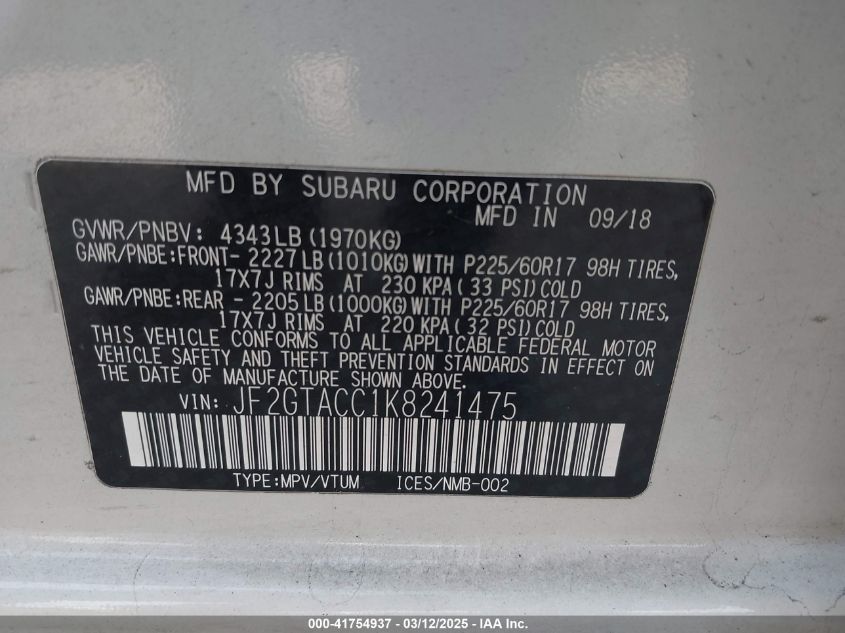 Color WhiteCylinders 4Drive Full driveVIN JF2GTACC1K8******State Run & Drive VerifiedDamage Front left AutoRIA
