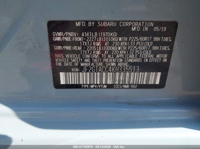 Color BlueCylinders 4Drive Full driveVIN JF2GTACC4KH******State Run & Drive VerifiedDamage Right side AutoRIA