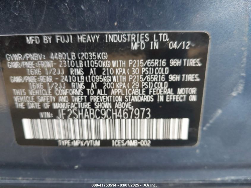 Color BlueCylinders 4Drive Full driveVIN JF2SHABC9CH******State Run & Drive VerifiedDamage Left side AutoRIA