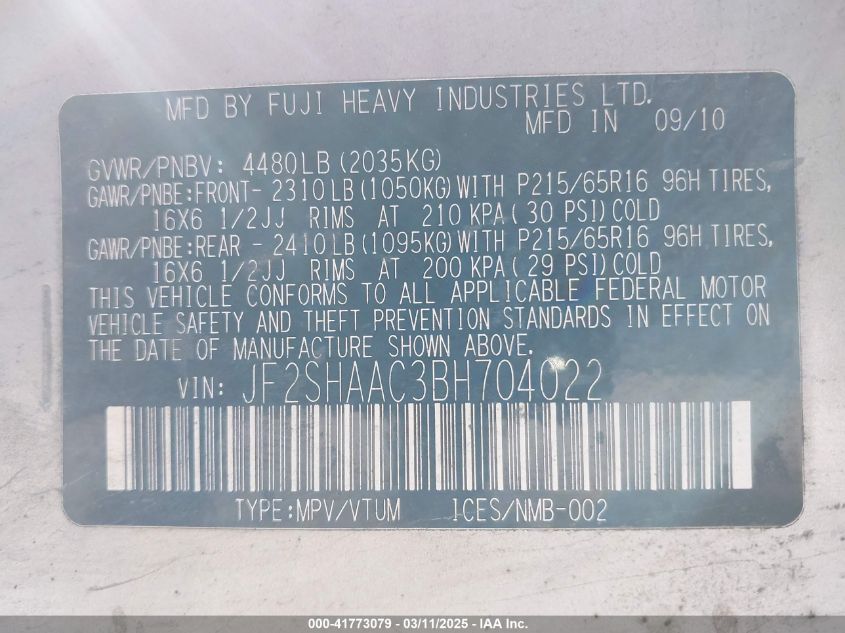 Color SilverCylinders 4Drive Full driveVIN JF2SHAAC3BH******State Run & Drive VerifiedDamage Right sideAuction date 2025-03-21 AutoRIA