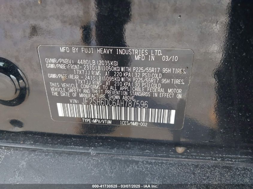 Color BlackCylinders 4Drive Full driveVIN JF2SH6DC6AH******State Run & Drive VerifiedDamage Front or backAuction date 2025-03-20 AutoRIA