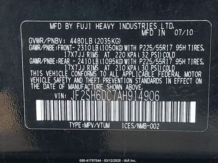 Color BlackCylinders 4Drive Full driveVIN JF2SH6DC7AH******State Run & Drive VerifiedDamage Rear leftAuction date 2025-03-20 AutoRIA
