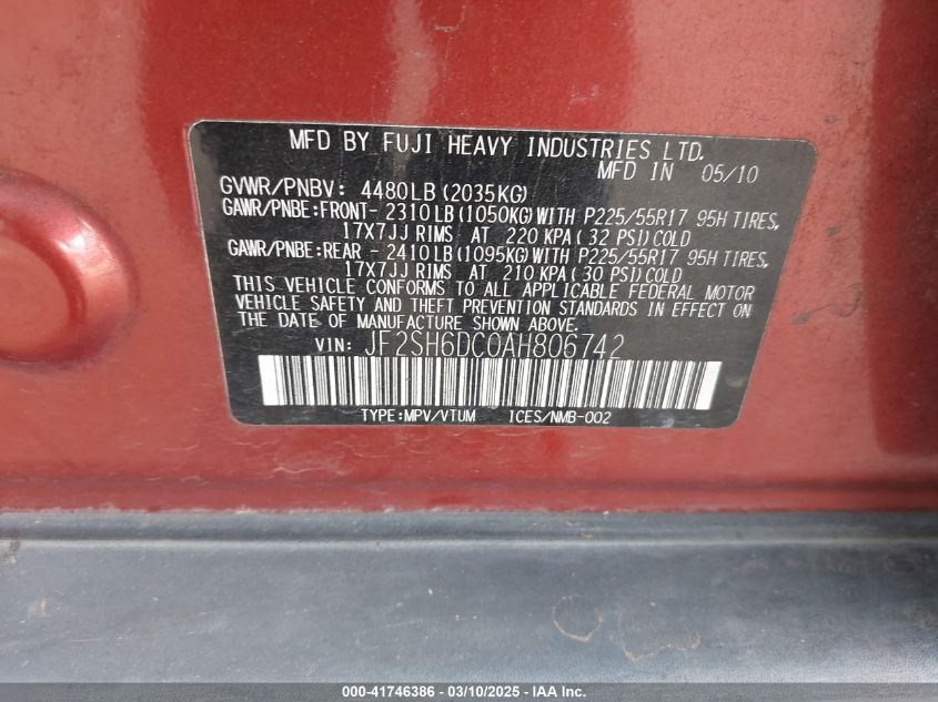 Color OrangeCylinders 4Drive Full driveVIN JF2SH6DC0AH******State Run & Drive VerifiedDamage InsignificantAuction date 2025-03-20 AutoRIA
