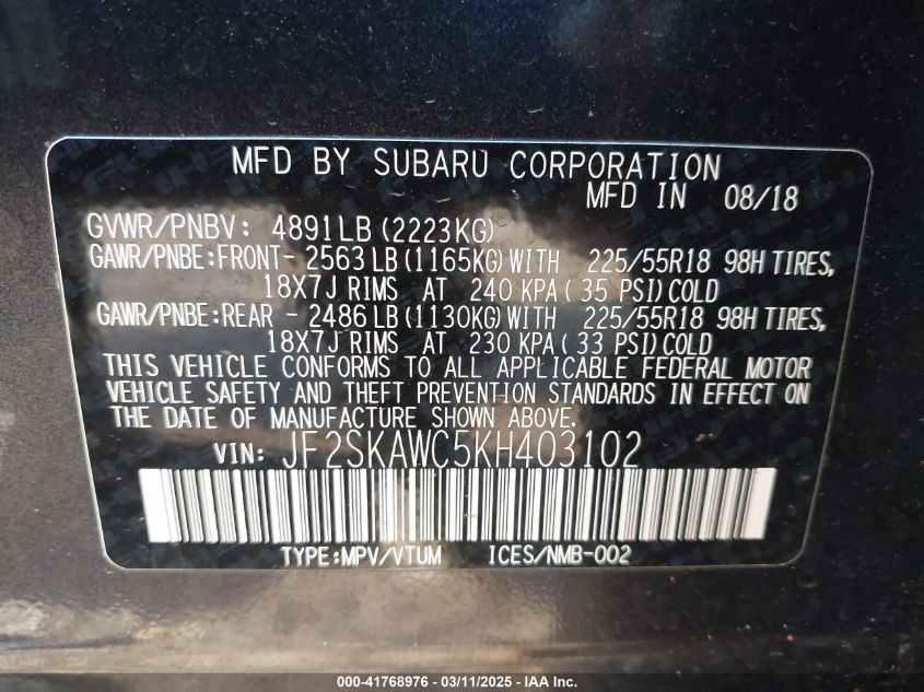 2019 SUBARU FORESTER 2019 Gasoline, 2.5, Full drive, VIN - JF2SKAWC5KH****** from the USA
