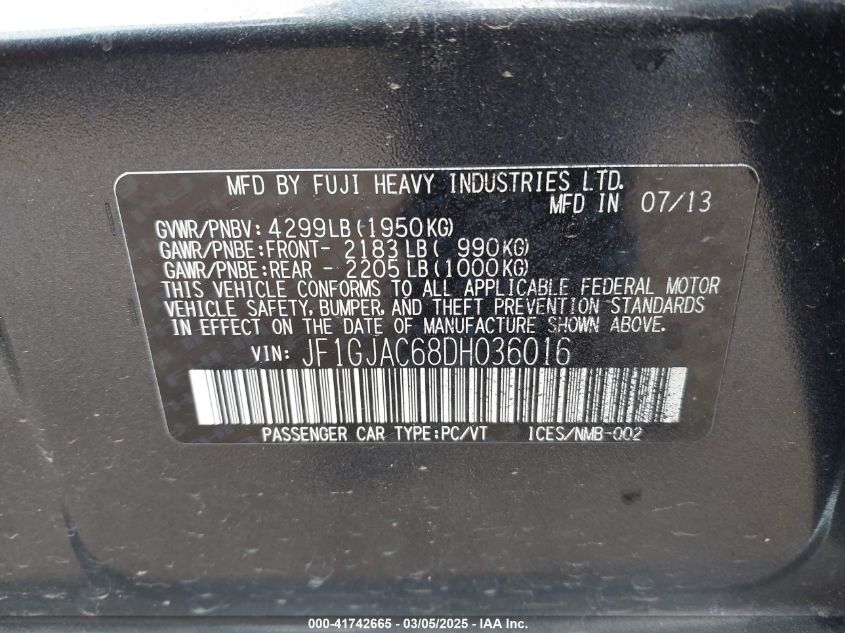 Color GrayCylinders 4Drive Full driveVIN JF1GJAC68DH******State Run & Drive VerifiedDamage Front or backAuction date 2025-03-24 AutoRIA