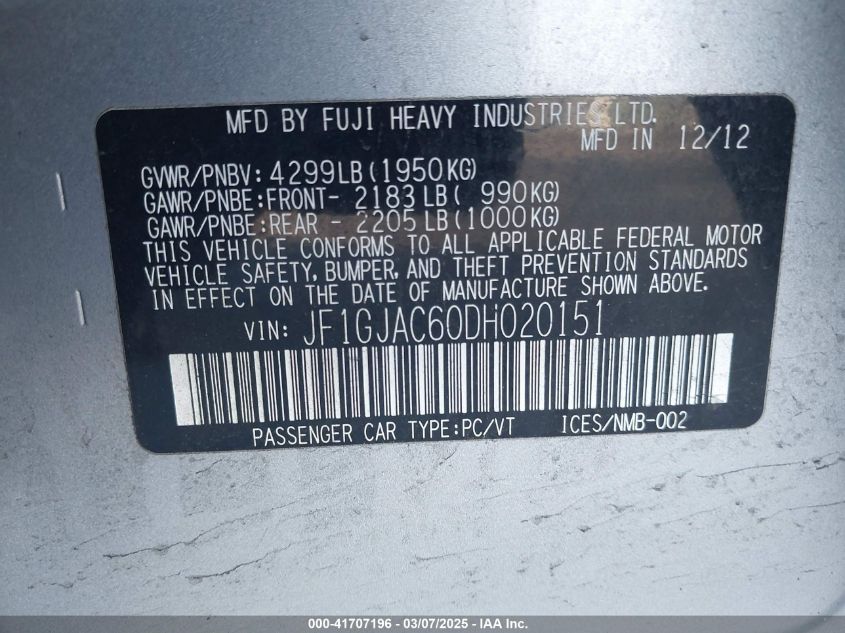 Color SilverCylinders 4Drive Full driveVIN JF1GJAC60DH******State Run & Drive VerifiedDamage BackAuction date 2025-03-24 AutoRIA
