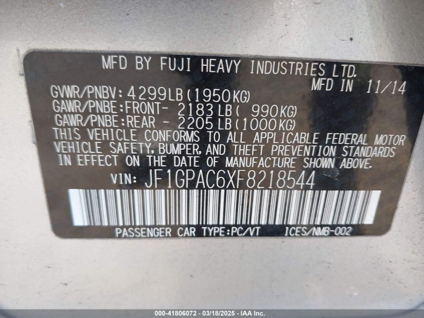 2015 SUBARU IMPREZA 2015 Gasoline, 2.0, Full drive, VIN - JF1GPAC6XF8****** from the USA