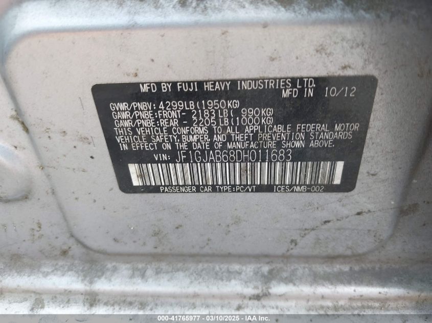 Color SilverCylinders 4Drive Full driveVIN JF1GJAB68DH******State Run & Drive VerifiedDamage Front or backAuction date 2025-03-20 AutoRIA