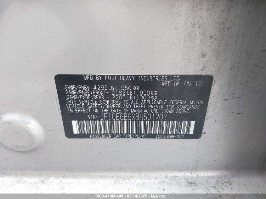 Color SilverCylinders 4Drive Full driveVIN JF1GE6B6XBH******State Run & Drive VerifiedDamage Left side AutoRIA