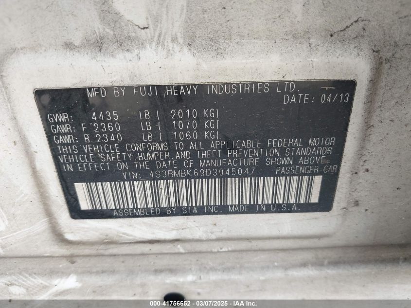 Color WhiteCylinders 4Drive Full driveVIN 4S3BMBK69D3******State Run & Drive VerifiedDamage Left sideAuction date 2025-03-20 AutoRIA