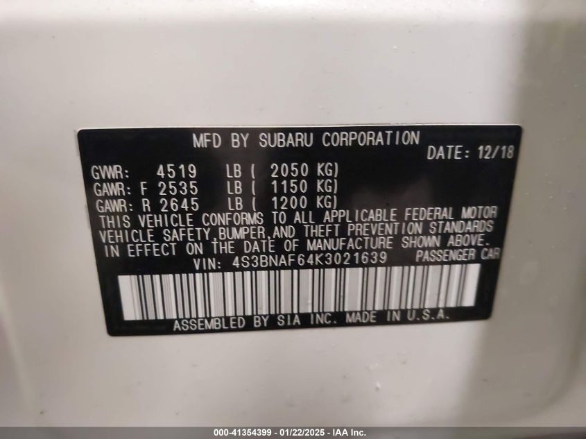 2019 SUBARU LEGACY 2019 Gasoline, 2.5, Full drive, VIN - 4S3BNAF64K3****** from the USA