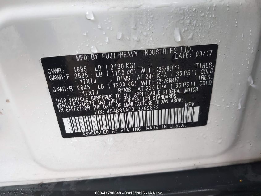 2017 SUBARU OUTBACK 2017 Gasoline, 2.5, Full drive, VIN - 4S4BSAAC3H3****** from the USA