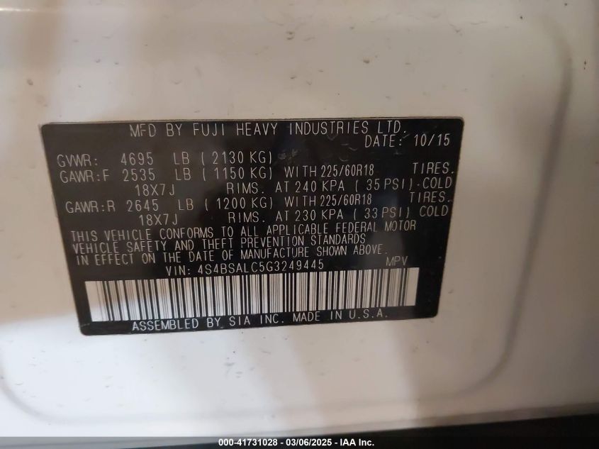 2016 SUBARU OUTBACK 2016 Gasoline, 2.5, Full drive, VIN - 4S4BSALC5G3****** from the USA