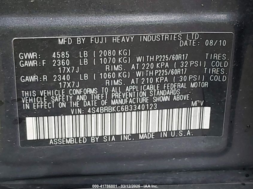 2011 SUBARU OUTBACK 2011 Gasoline, 2.5, Full drive, VIN - 4S4BRBKC6B3****** from the USA