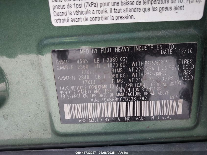 Color GreenCylinders 4Drive Full driveVIN 4S4BRBKC7B3******State Run & Drive VerifiedDamage Front or backAuction date 2025-03-26 AutoRIA