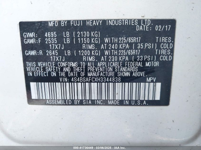 2017 SUBARU OUTBACK 2017 Gasoline, 2.5, Full drive, VIN - 4S4BSAFCXH3****** from the USA