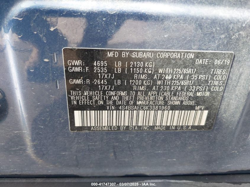 2019 SUBARU OUTBACK 2019 Gasoline, 2.5, Full drive, VIN - 4S4BSAFC6K3****** from the USA