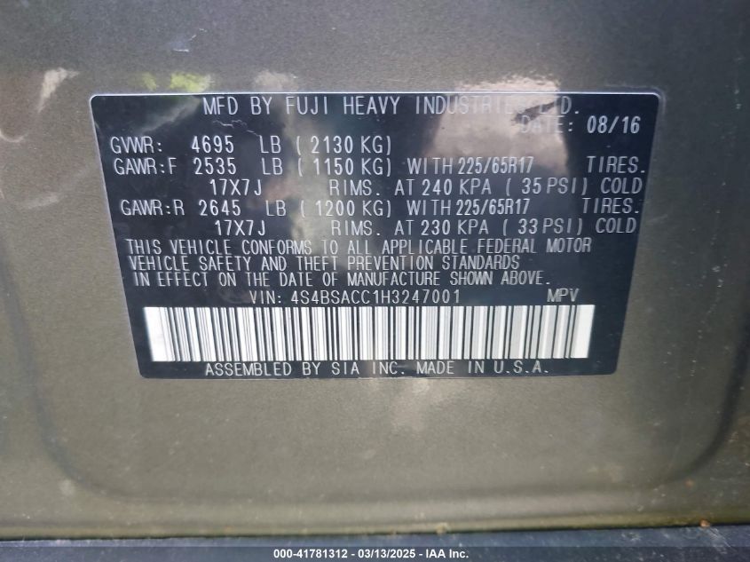 2017 SUBARU OUTBACK 2017 Gasoline, 2.5, Full drive, VIN - 4S4BSACC1H3****** from the USA