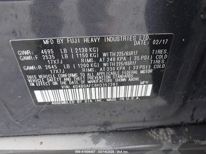 2017 SUBARU OUTBACK 2017 Gasoline, 2.5, Full drive, VIN - 4S4BSAFC8H3****** from the USA
