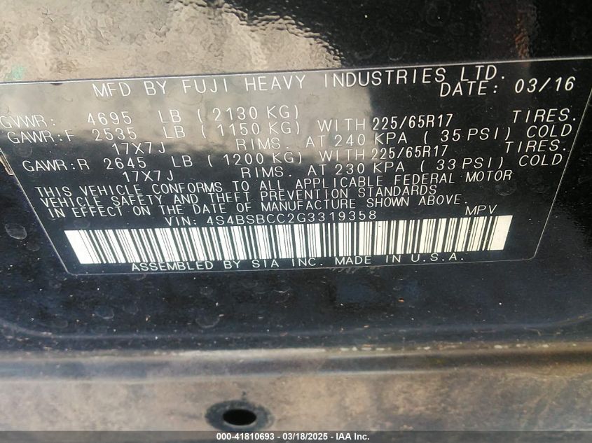 Color BlackCylinders 4Drive Full driveVIN 4S4BSBCC2G3******State Run & Drive VerifiedDamage Front left AutoRIA