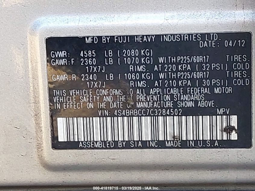 2012 SUBARU OUTBACK 2012 Gasoline, 2.5, Full drive, VIN - 4S4BRBCC7C3****** from the USA