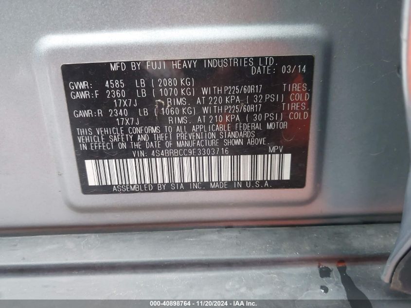Color BlackCylinders 4Drive Full driveVIN 4S4BRBCC9E3******State Run & Drive VerifiedDamage Front or back AutoRIA