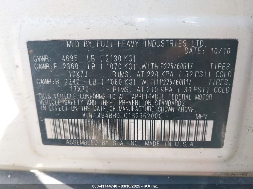 2011 SUBARU OUTBACK 2011 Gasoline, 3.6, Full drive, VIN - 4S4BRDLC1B2****** from the USA