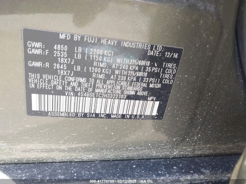 2017 SUBARU OUTBACK 2017 Gasoline, 3.6, Full drive, VIN - 4S4BSETC2H3****** from the USA