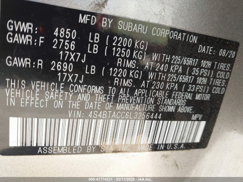 2020 SUBARU OUTBACK 2020 Gasoline, 2.5, Full drive, VIN - 4S4BTACC6L3****** from the USA