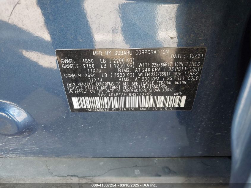 2022 SUBARU OUTBACK 2022 Gasoline, 2.5, Full drive, VIN - 4S4BTAFC6N3****** from the USA