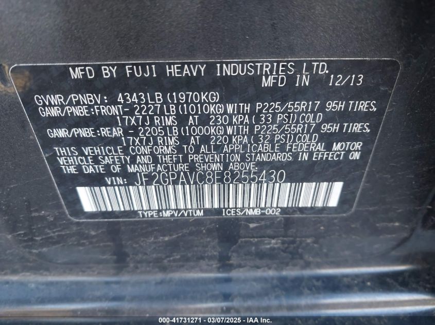 Color BlackCylinders 4Drive Full driveVIN JF2GPAVC8E8******State Run & Drive VerifiedDamage BackAuction date 2025-03-21 AutoRIA