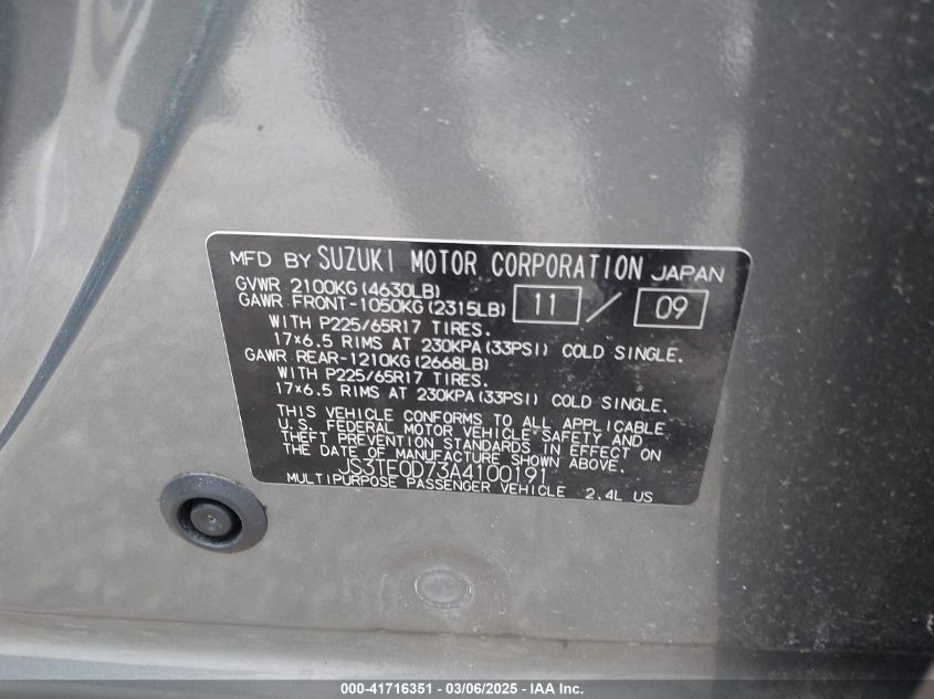 2010 SUZUKI GRAND VITARA 2010 Gasoline, 2.4, Unknown, VIN - JS3TE0D73A4****** from the USA