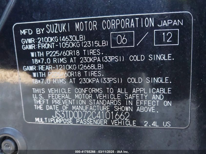 2012 SUZUKI GRAND VITARA 2012 Gasoline, 2.4, Full drive, VIN - JS3TD0D72C4****** from the USA