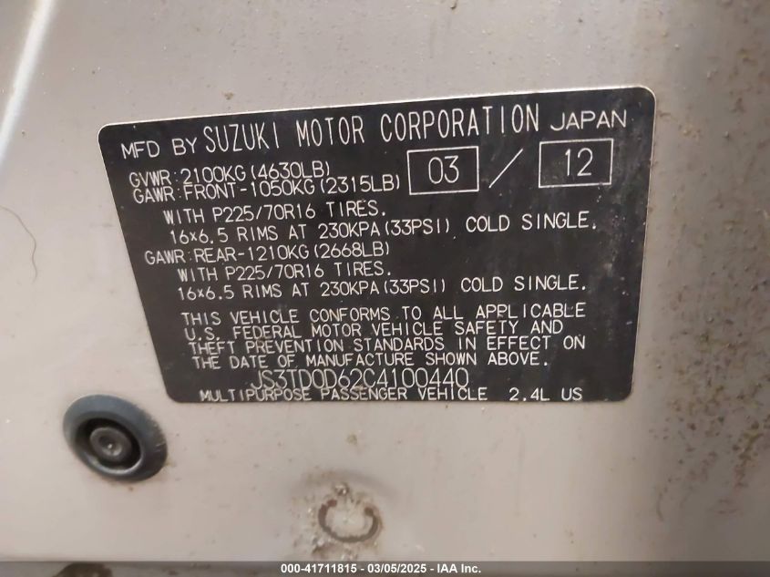 2012 SUZUKI GRAND VITARA 2012 Gasoline, 2.4, Full drive, VIN - JS3TD0D62C4****** from the USA