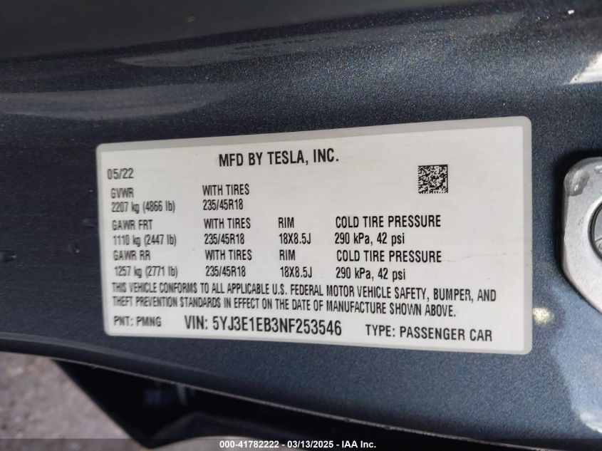 2022 TESLA MODEL 3 2022 Electric, U, Full drive, VIN - 5YJ3E1EB3NF****** from the USA