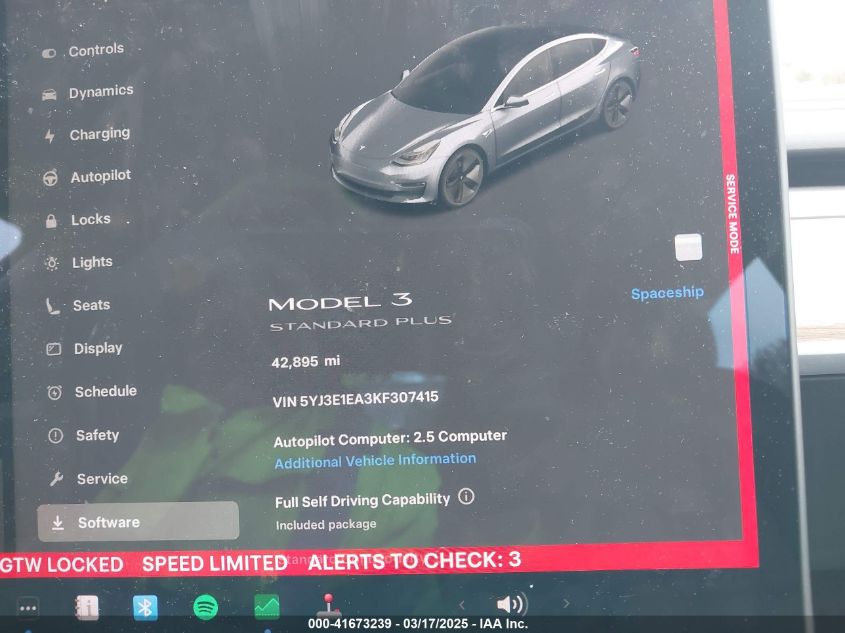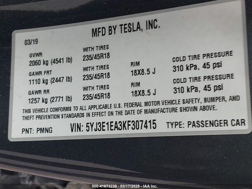 2019 TESLA MODEL 3 2019 Electric, U, Rear wheel drive, VIN - 5YJ3E1EA3KF****** from the USA