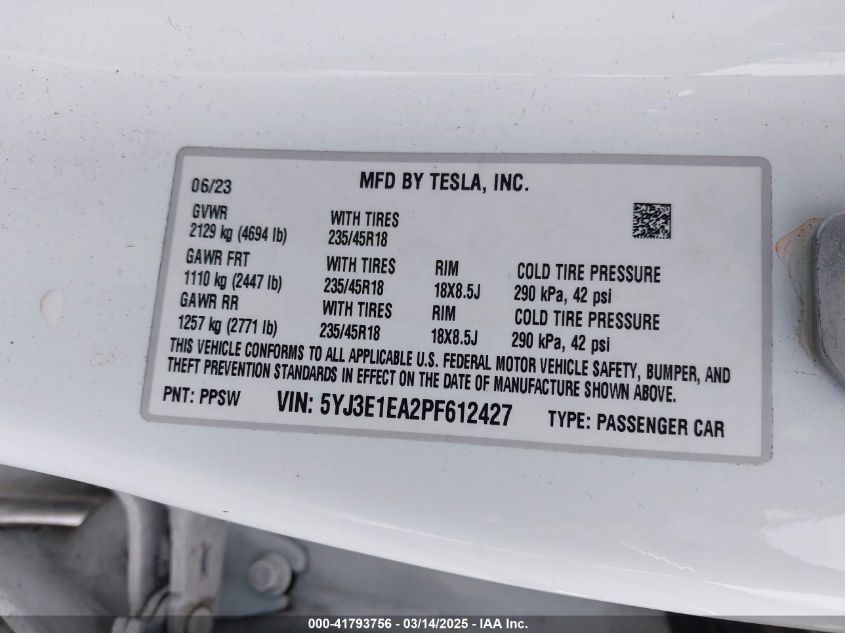 2023 TESLA MODEL 3 2023 Electric, U, Rear wheel drive, VIN - 5YJ3E1EA2PF****** from the USA