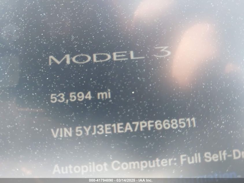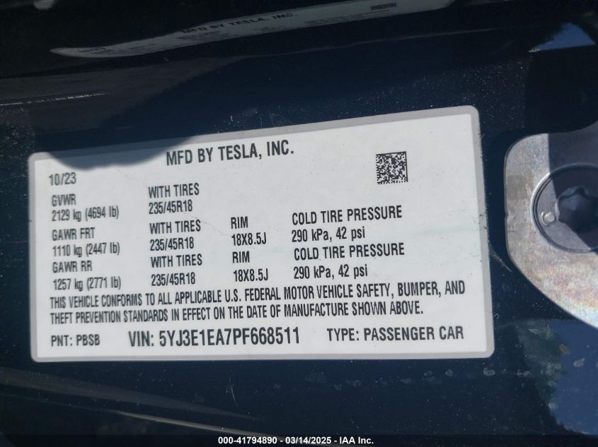 2023 TESLA MODEL 3 2023 Electric, U, Rear wheel drive, VIN - 5YJ3E1EA7PF****** from the USA