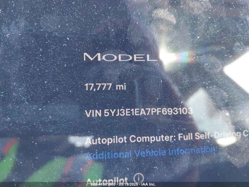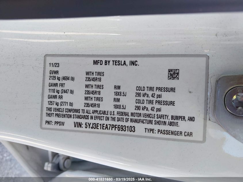 2023 TESLA MODEL 3 2023 Electric, U, Rear wheel drive, VIN - 5YJ3E1EA7PF****** from the USA