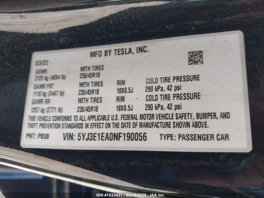 2022 TESLA MODEL 3 2022 Electric, U, Rear wheel drive, VIN - 5YJ3E1EA0NF****** from the USA