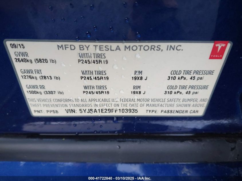 2015 TESLA MODEL S 2015 Electric, U, Full drive, VIN - 5YJSA1E29FF****** from the USA