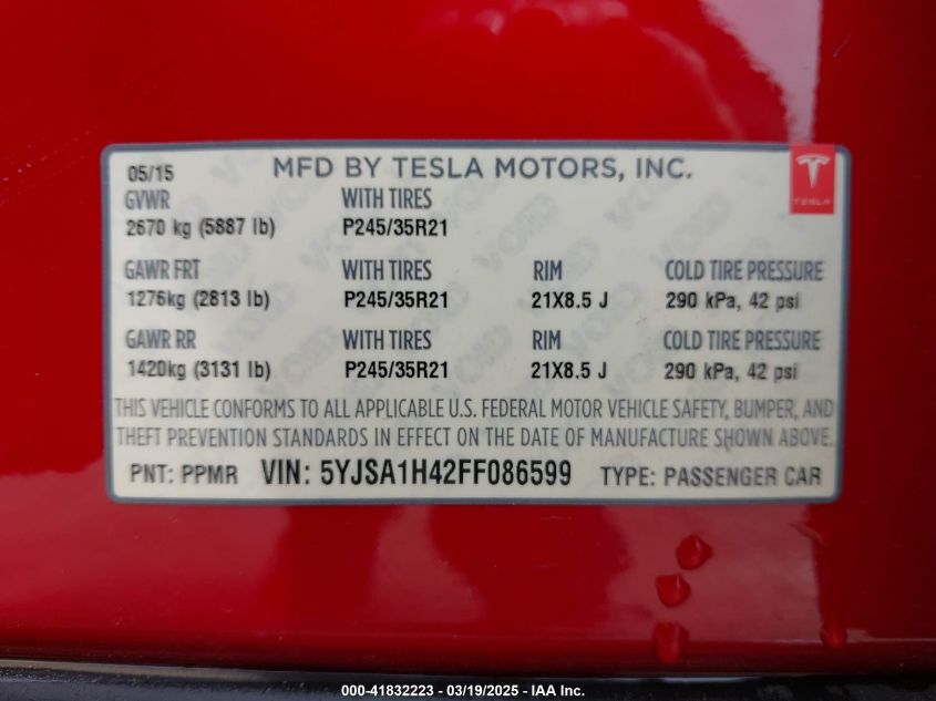 2015 TESLA MODEL S 2015 Electric, U, Full drive, VIN - 5YJSA1H42FF****** from the USA