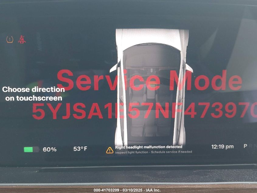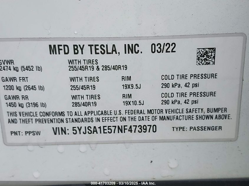 Color WhiteDrive Full driveVIN 5YJSA1E57NF******State Run & Drive VerifiedDamage Front rightAuction date 2025-03-20 AutoRIA