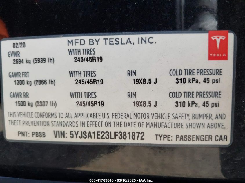 2020 TESLA MODEL S 2020 Electric, U, Full drive, VIN - 5YJSA1E23LF****** from the USA