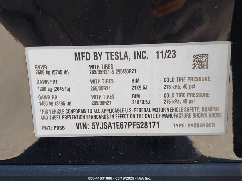 2023 TESLA MODEL S 2023 Electric, U, Full drive, VIN - 5YJSA1E67PF****** from the USA