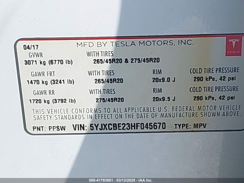 2017 TESLA MODEL X 2017 Electric, U, Full drive, VIN - 5YJXCBE23HF****** from the USA